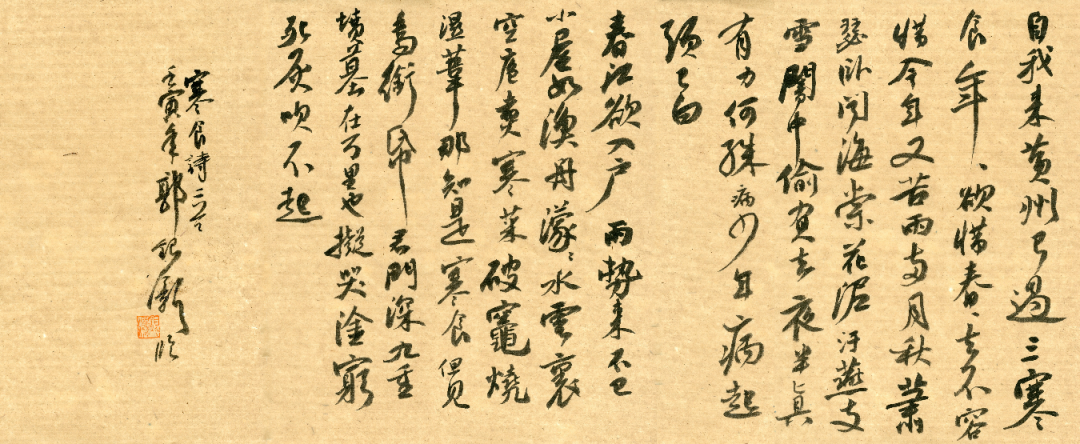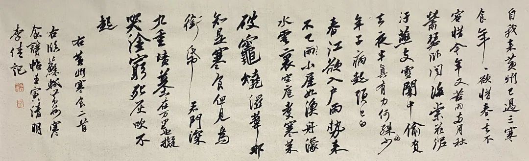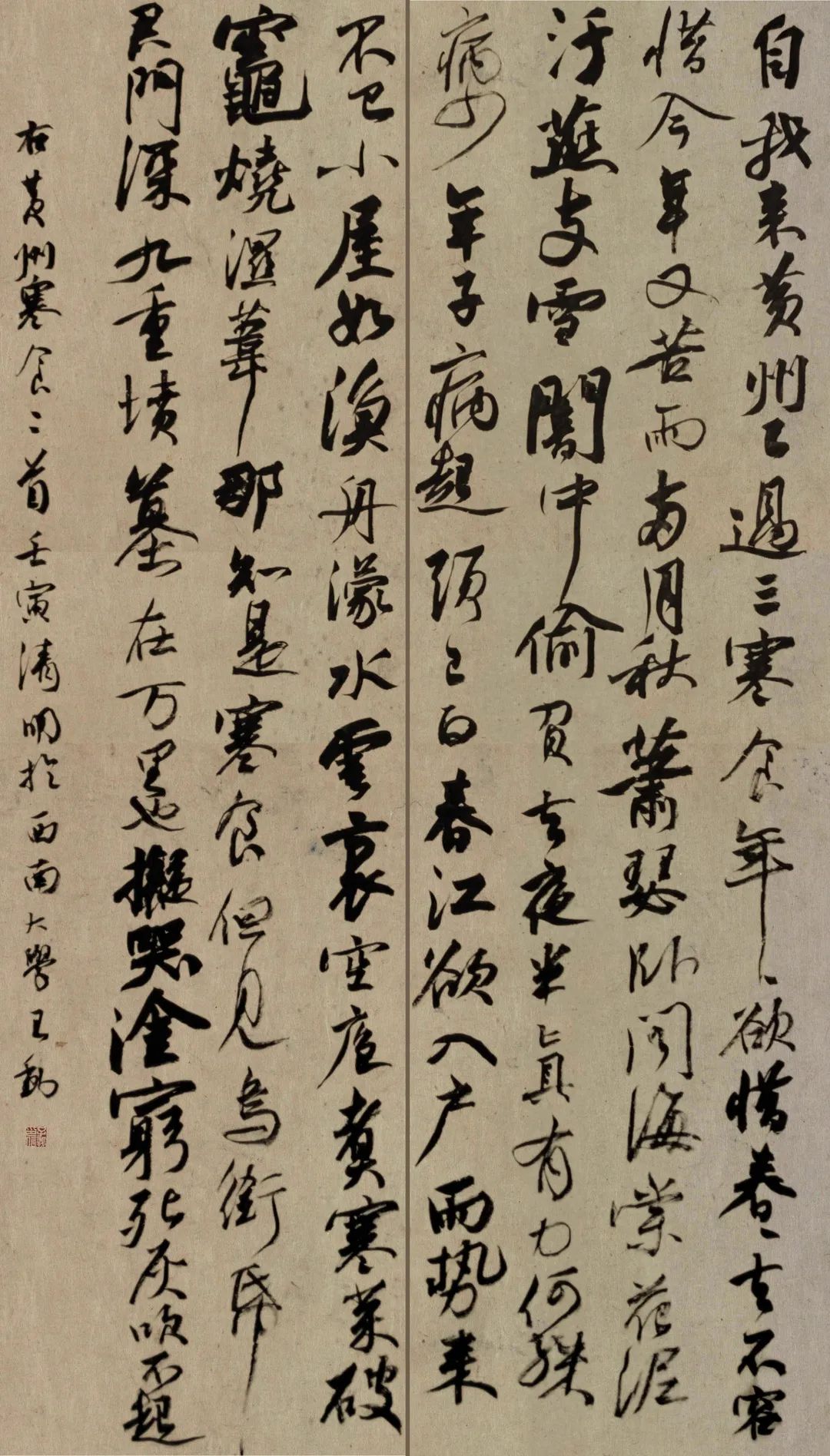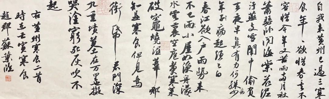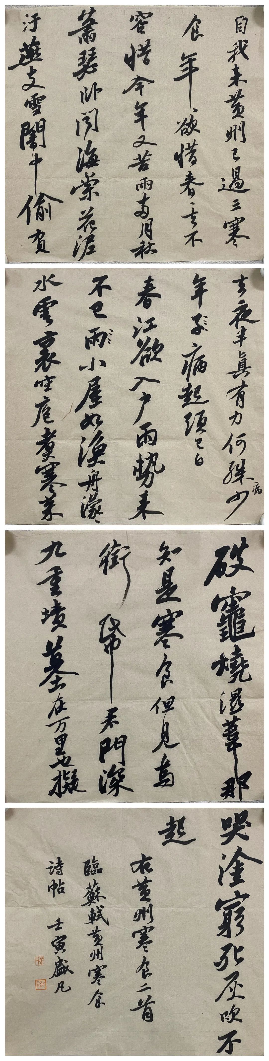 元丰五年寒食节,苏轼到黄州已经第三个年头了。此时,东坡的菜蔬已经满畦,新居雪堂也已落成。虽然有了安居之所,苏轼已变“东坡先生”,但东坡报效朝廷“致君尧舜”的初心未改。在苦雨不已的寒食节,东坡的内心也如春雨,波澜不已,于是提笔写下了千古名帖《寒食帖》。1040年后的今天,我所师生共临 《寒食帖》,再细细体会东坡当年内心的跌宕起伏,再去体会东坡那种“君门深九重,坟墓在万里”的孤寂之情,再用毛笔去表现东坡心中所思所表,多人所临,多个《寒食帖》,多个“心中的东坡”。谨以此致敬东坡!