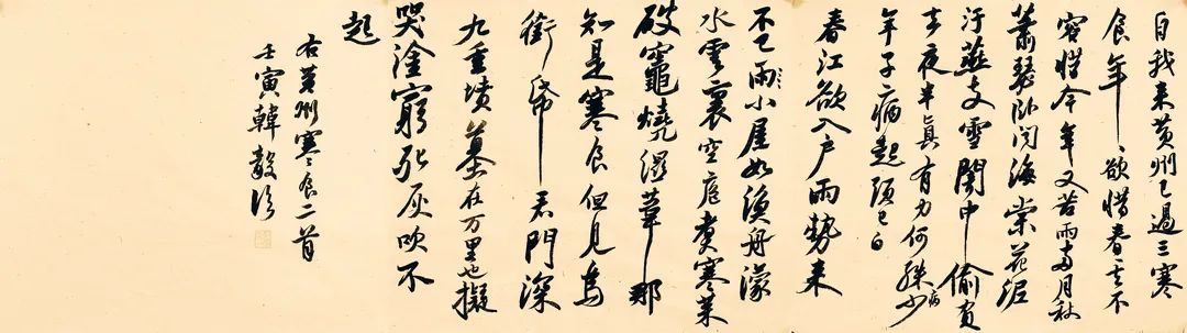 临习心得:初见寒食帖,应是昔年习书时在书架众多字帖中的随手一翻。彼时年幼,只知坡公垂芳千载,不省苏仙之墨妙。时在壬寅清明,由眉山市人民政府与永利集团校地合作的《苏轼书法全集》即将出版的佳音传来,曹师乘此天时人和,带头临摹寒食诗帖。我亦从师临寒食帖数遍,奈何心粗手劣,笔墨不精。对坡公笔法领悟尚浅,形神俱失。方知应沉下心来,对每一字、每一点画认真琢磨,想拟古人书写之状态、节奏,刻苦练习,才能得一二分古意。三月初十记以自勉。