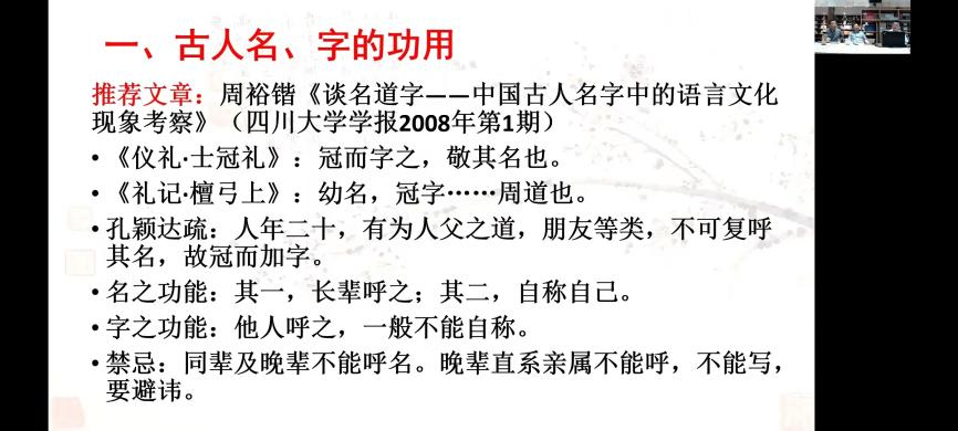 讲座首先从古人的名、字以及号的功用谈起。杨老师概括道,名是长辈和自己对自己的称呼,而不用于同辈和晚辈称呼自己。古代男子成年后不便直呼其名,故另取一个与本名涵义相关的别名,称之为“字”。字作为他人对自己的称呼,一般不用于自称。不同的是,作为自命自取的别号,自号不仅能方便他人对自己的称呼,而且是自我认定之后的一个代号,可用于自称。从传世文献来看,东晋文学家陶渊明以描述他人的口吻而作《五柳先生传》,实则是为自我立传,文中记载其号为“五柳先生”或可视为自号现象的历史渊源。