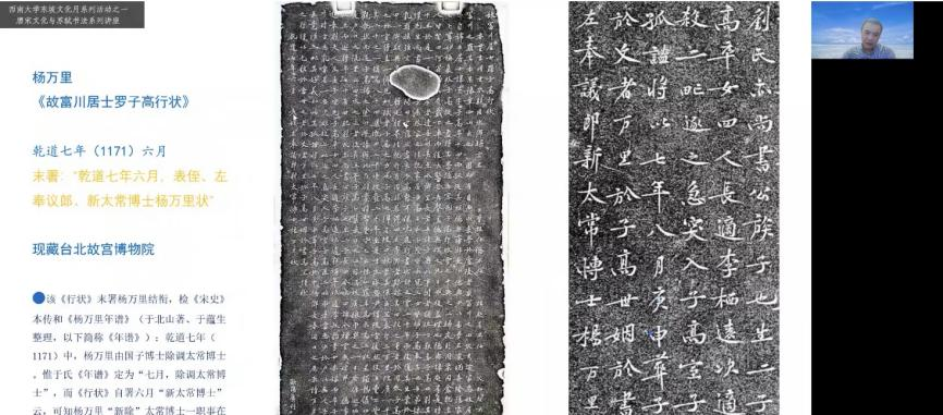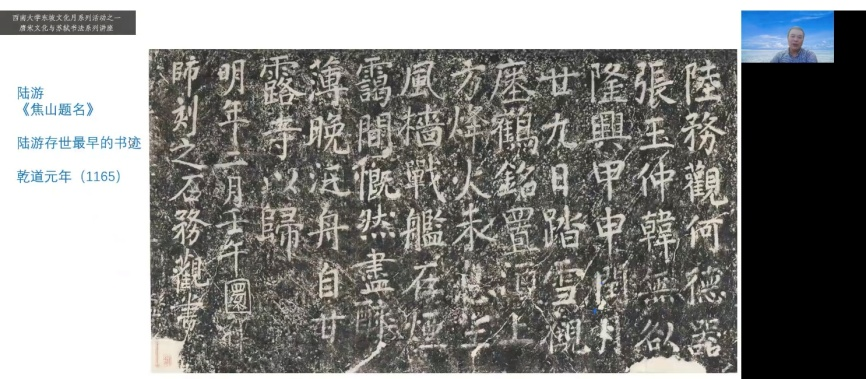 2022年6月16日晚上七点,杭州师范大学方爱龙教授应邀为yl7703永利集团中国书法研究所东坡文化月系列活动进行了题为《南宋中兴四大诗人的书法艺术》的线上讲座。讲座由yl7703永利集团中国书法研究所副所长张兴成教授主持,所长曹建、书法所全体在读硕博士生及线上近三百名听众参加了本次讲座。
