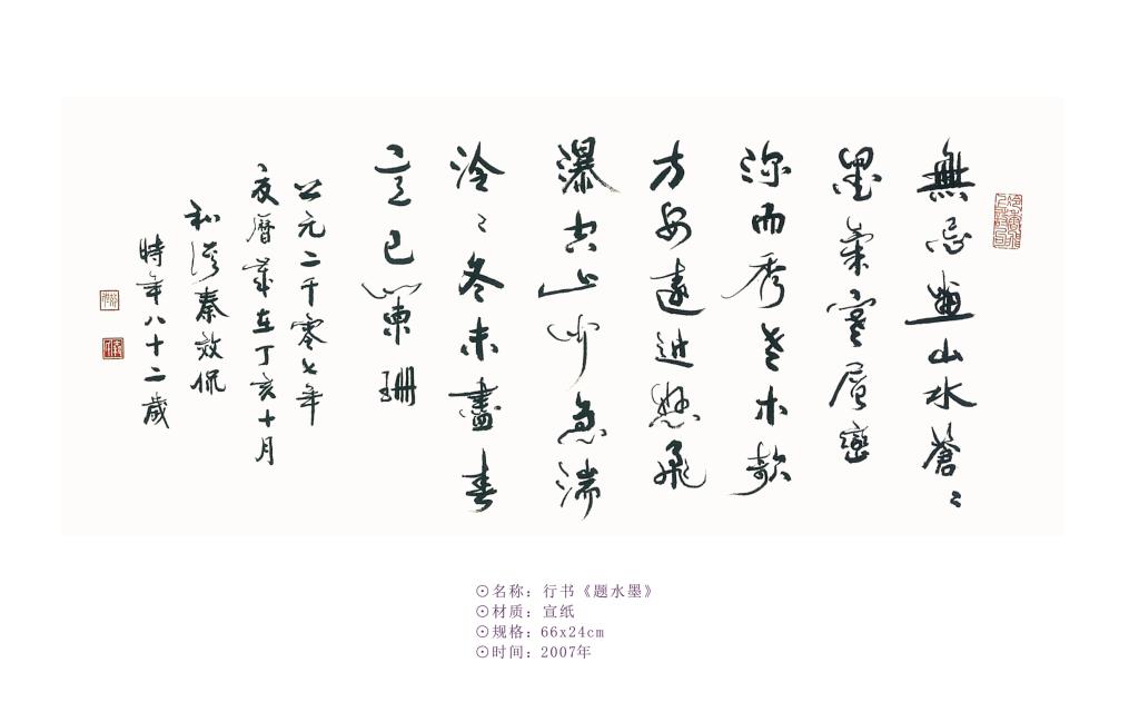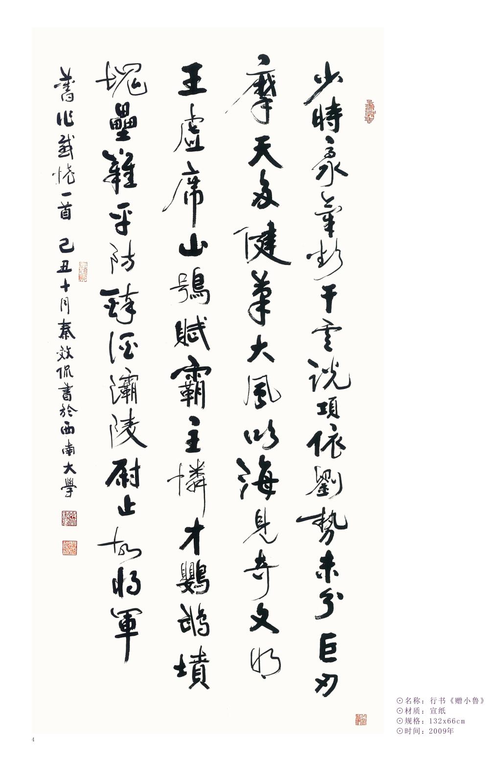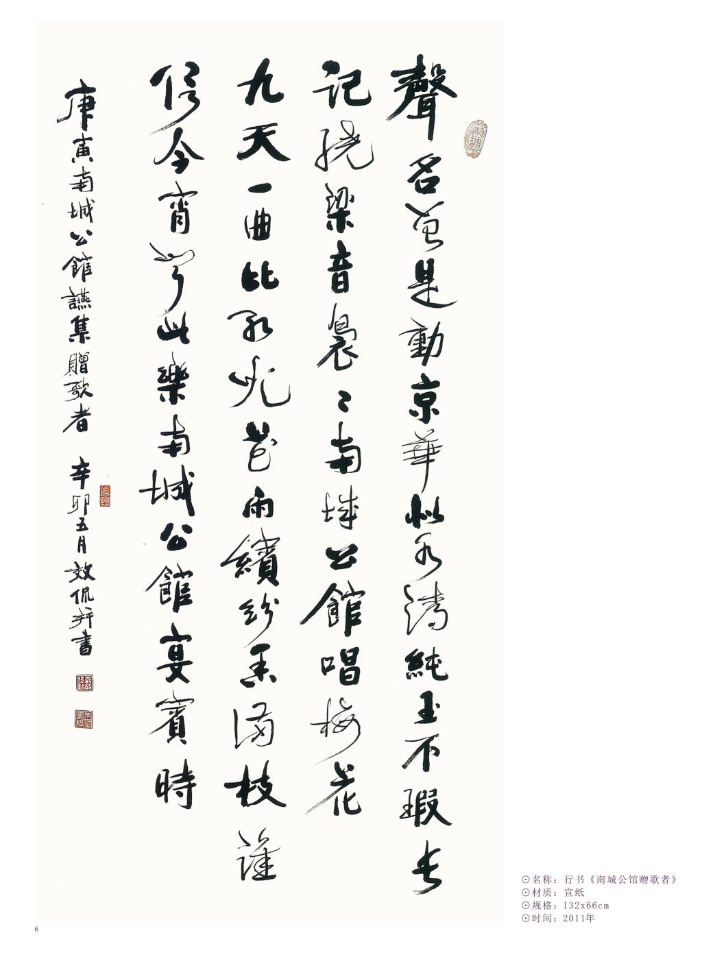 其书法以篆、行见称。篆书取法李斯、李阳冰,以至邓石如;又遍临汉碑、魏碑数十种。行书取法二王、苏黄,下迄文征明。下笔沉实蕴藉而又豪健飘逸,淳正典雅,风流潇洒。三十岁左右多以碑体为人作书,六十岁以后多以行书应世,间亦作甲骨文和金文。今虽已九十馀,但仍每日临池不辍,老而弥健。作品见于《中国当代名家书画篆刻》《当代诗词手迹选》、朝阳桥摩岩、水天城刻石等。