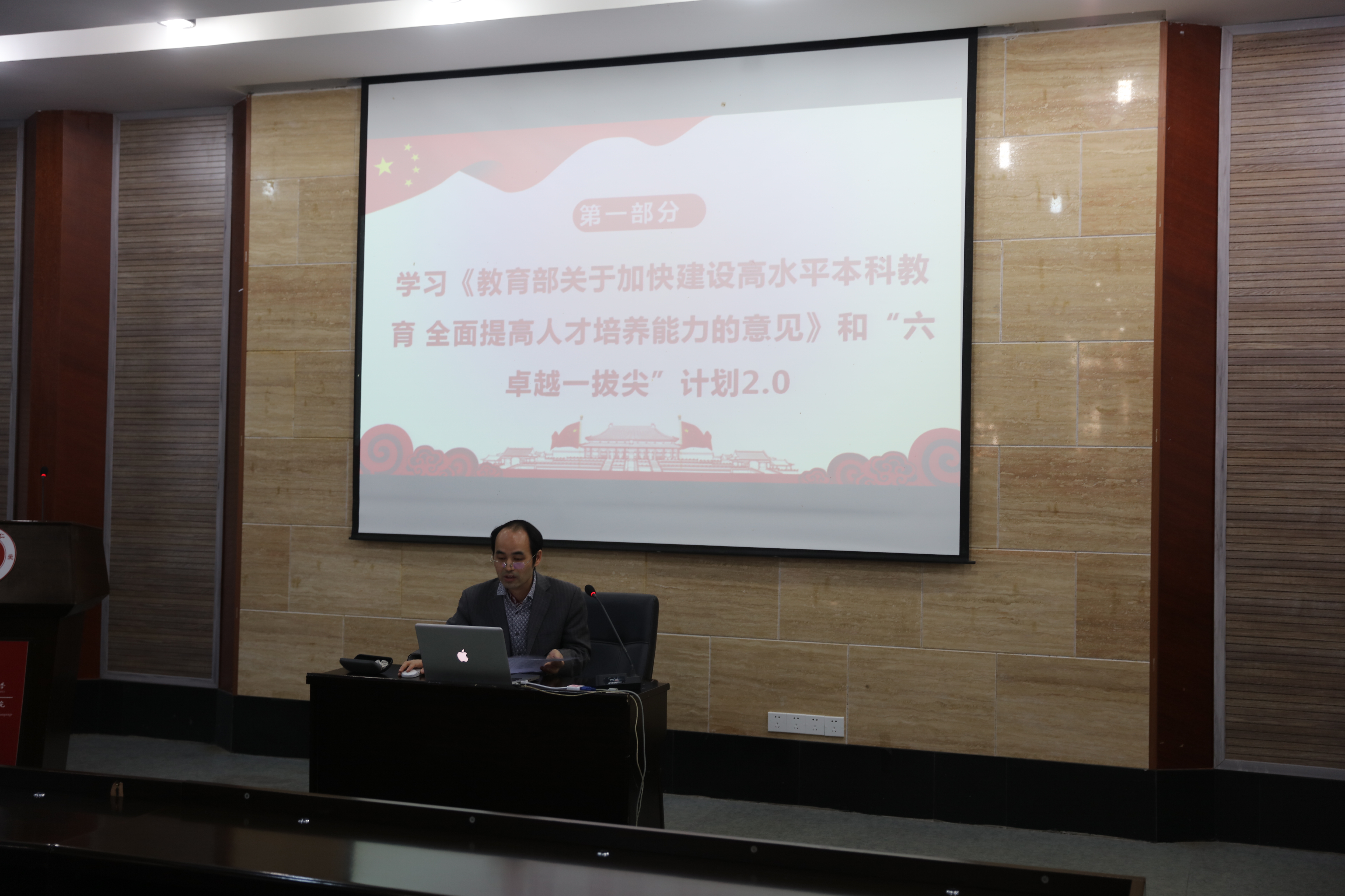 随后,张春泉副院长传达了学校2018年本科教育工作会精神。张院长指出,学院要办一流的本科教育就要坚持“以本为本、四个回归”。高等院校的根本任务在于立德树人,本科教育处于核心地位,办好本科教育要加强人才培养体系建设,将本科教育各个环节进行实质性深度化的融合,实现全员、全过程、全方位育人。